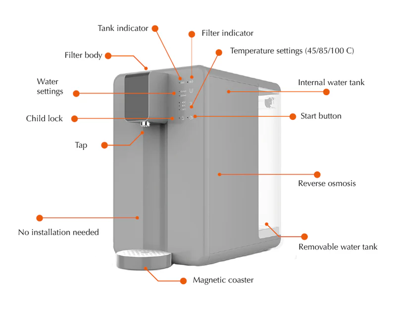 The Poseidon is a countertop model based on reverse osmosis. It is easy to use and needs no installation. You can set the water temperature in 3 positions: 45/80/100 degrees Celsius. The system is equipped with a filter indicator and water indicator and has a self-cleaning function.